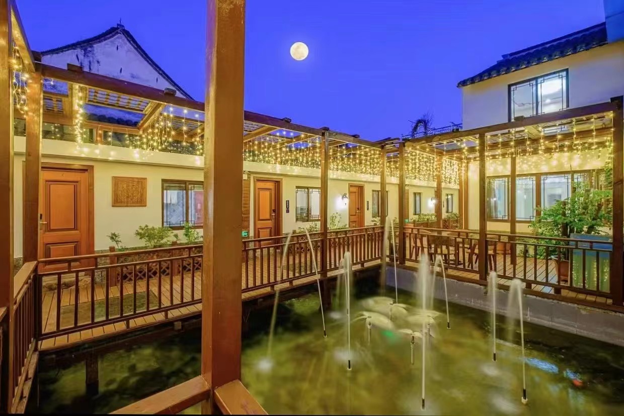 浙江嘉兴西塘龙泽精品会所民宿是西塘一家高档酒店式农家乐,坐落在邮电东路胥塘桥即平桥旁,地理位置优越。民宿内有鸟语花香的大庭院,赏心悦目的喷泉水景池,有豪华休闲吧,邀您一起来看电影,一起K歌,另有精品会议室,设有麦克风,投影仪,音响等设备,供您享用。适合朋友结伴团聚、会议、团建等,周边生活圈也十分方便。入住龙泽,让你在流水潺潺虫声唧唧之中醒来,在古色古香的小镇度日,感受浓郁地方文化。 西塘一餐一宿·龙泽民宿规模适中,配套设施齐全,配备专业的KTV设备、棋牌等娱乐设施,集休闲、度假、观景、娱乐为一体。 住宿环境: 客房:能同时入住59人,房型有标间、大床房、三人间、亲子间,房间均配有中央热水器,24小时供应热水,床单被套一客一换。 客房设施:每个房间均配有独立卫生间、电视、空调和无线WiFi。