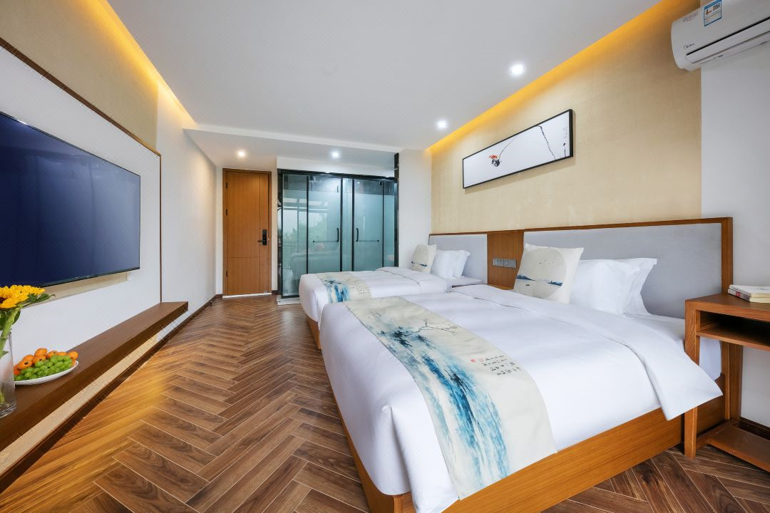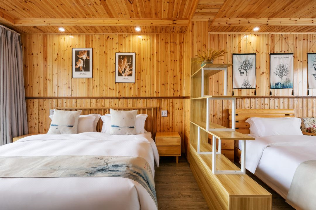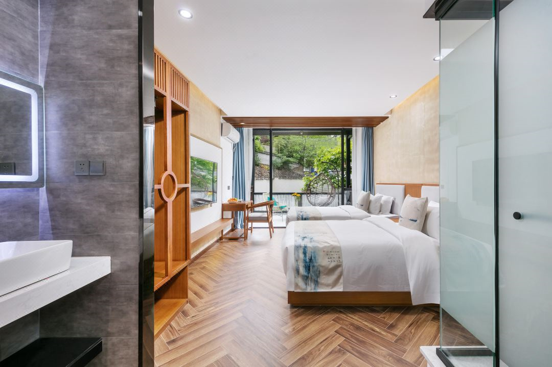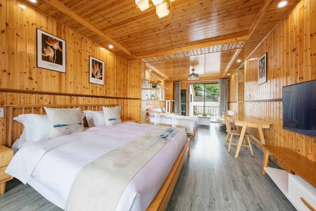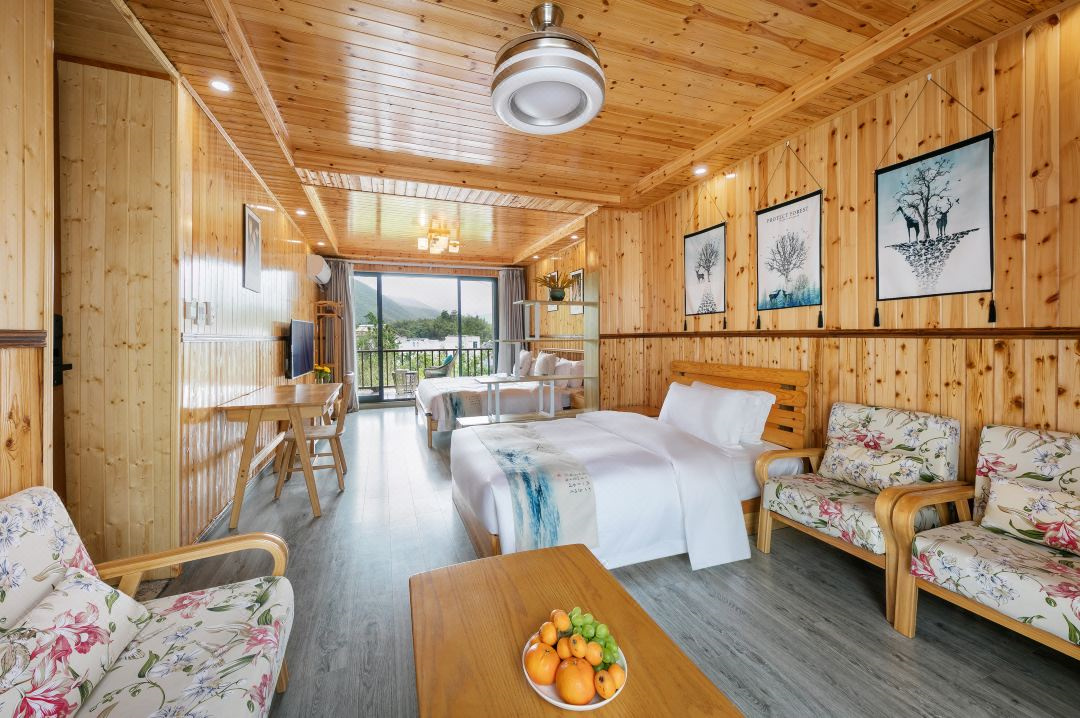 芳华阁度假民宿位于浙江湖州德清,坐落于莫干山镇后坞村景区内,紧邻莫干山主景区,背靠竹林大山,连绵山脉,视野开阔。“云住青山山不老,水去尘土土未净”描绘的就是这里的味道和景致。民宿冬暖夏凉,休闲大客厅、餐厅、大阳台、泳池、鱼池、蹦床、草坪庭院、会议厅、KTV、麻将房、团建多功能厅应有尽有。您可以在客栈喝茶、喝咖啡、看书;也可以到附近的田野小溪散步,顺着古道逛到莫干山主景区;抑或是在大阳台上练瑜珈,在大草坪上拍美美的照片。客栈的女主人热爱烹饪,用当地的传统方法烹制农家菜,她烧的土鸡煲、红烧鱼、有机蔬菜等远道而来的客人吃了都说好。民宿的设计和改造旨在营造舒适、静心的私密空间,每一个房间都有外挑式露台,让人与自然融为一体。去除旅途的疲乏,舒展身心,守护您一整晚的好眠。真正让您体验到山川为伴,鸟兽为朋的山野意境。好客的主人会为您泡上一壶当地特有的莫干黄芽,与您一起放缓生活的脚步,陪您一起早观日出,夜数星星。“行到水穷处,坐看云起时”,芳华阁期待和您开启一场慢生活之旅。 芳华阁度假民宿规模适中,配套设施齐全,配备专业的KTV设备、棋牌等娱乐设施,集休闲、度假、观景、娱乐为一体。 住宿环境: 客房:能同时入住33人,房型有标间、三人间、亲子间、大床房,房间均配有中央热水器,24小时供应热水,床单被套一客一换。 客房设施:每个房间均配有独立卫生间、电视、空调和无线WiFi。