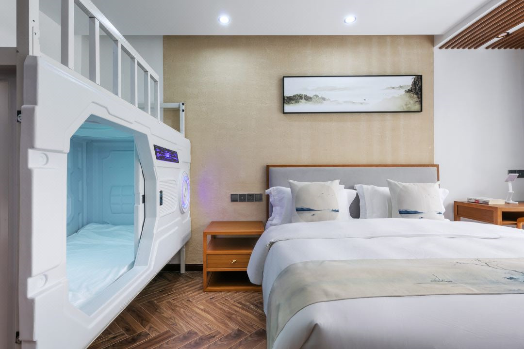 标间8间(1.35),亲子间2间(1.8+太空舱),大床房4间(1.8),三人间4间(1.8+1.2)